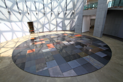 중앙홀에 들어서면 작품 「공시성Synchronicity 」이 가장 먼저 관람객을 맞이한다. 「공시성」은 160개 도판이 모여 지름 14미터에 이르는 원형 작품이다. 작가는 매순간 변화하는 표면을 만들기 위해 20여 가지의 어두운 유약을 입혀 번조했다. 최대 길이 1미터73센티미터에 이르는 직사각형의 도판은 멀리서 보면 매끄럽고 단단한 재질이지만, 그 면면을 가까이 들여다보면 각기 다른 검은 계열의 색상과 질감을 확인할 수 있다. 이렇게 군집된 모습은 주변 환경에 의해 매순간 다른 풍경을 총체적으로 조감하게 한다. 또한 해석의 전형성에서 벗어나 작품을 새롭게 인식할 수 있는 단초를 제공한다.