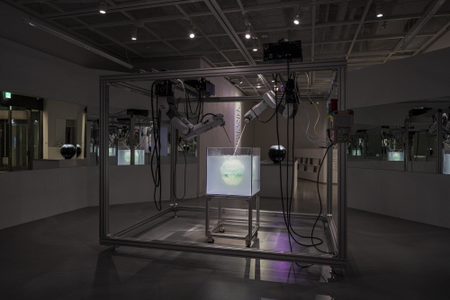 전시장에 들어서면 가장 먼저 도예가 김시영의 「서가흑자 달항아리」와 만나게 된다. 철과 마그네슘으로 이루어진 달이 실은 검회색이라는 점에서 ‘달항아리’라는 이름에 진정 걸맞는 작품이라 할 수 있다. 그런데 흑자라고 온통 검지만은 않다. 도예가가 고유의 유약을 입혀 1300°C 이상의 고온에서 번조하는 과정에서 요변 현상 이 일어나 다양한 색이 발현되었다. 천영환 작가는 ‘푸른 색, 녹색, 보라색 등’ 다양한 색을 품고 있는 「서가흑자 달 항아리」에서 영감을 얻어 자신만의 물질과 색으로 완전히 새로운 개념의 달항아리를 만드는 실험에 도전했다. 그 결과물이 「서가흑자 달항아리」 바로 뒤에 전시되었다. 로봇팔이 장착된 큰 사각 프레임 안, 작은 수조 안에 떠 있는 ‘달항아리’ 형태의 물체. 이 전시에서 「서가흑자 달 항아리」는 실마리를 던질 뿐, 이를 구현한 결과물보다는 그 결과물에 이르기까지 질문을 던지며 답을 찾아나가는 과정에 중점을 두고 있다. 그러므로 전시를 제대로 감상 하려면 작가와 마찬가지로 탐구하는 자세로 연구 과정의 이야기에 귀기울여야 한다.