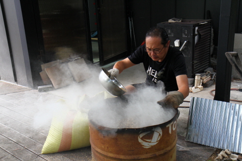 그는 직접 축조한 작은 가마로 번조한다. 드럼통, 내열벽돌 등으로 제작한 라쿠가마에 비해 열효율이 좋기 때문이다. 가스로 온도를 조절하고, 상부의 불구멍으로 온도를 확인할 수 있어 섬세한 환원 분위기 조절이 가능하다. 전면 개방으로 재임·해임의 편의성을 더했다.