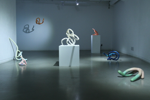 윤서정 작가의 <A와 X사이의 몸짓들>전이 지난 7 월 22일부터 8월 9일까지 19일간 갤러리밈에서 열렸다. 이번 전시는 개체 사이의 관계에서 발견되는 변화의 순간을 주제로, 변화를 거듭하며 다른 것으로 ‘됨’을 반복하는 자아를 표현했다. 신체에 걸치거나 착용할 수 있는 형태의 조형 6점을 전시하고, 작품을 통과하는듯한 몸짓을 촬영한 영상을 상영했다. 작가는 “영상과 작품을 함께 전시해 우연성을 즐기는 신체의 에너지를 전달하고자 했다.”고 전했다.