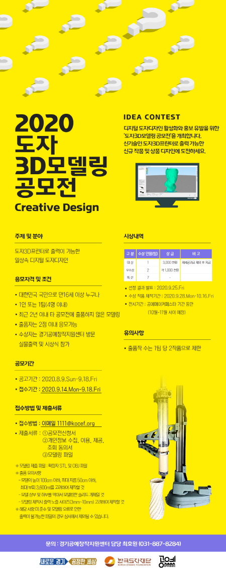 경기창작지원센터에서 열리는 <도자3D모델링공모전> 공모요강이 발표됐다. 공모 부문은 도자3D프린터로 출력가능한 디자인으로 디 지털 도자디자인 활성화에 기여할 수 있는 작품에 한한다. 접수기간 은 9월 14일부터 18일까지 5일간으로, 제출내용은 공모전신청서, 개인정보 조회 동의서, 모델링 파일(확장자 STL 및 OBJ 파일)을 이메일 접수(1111@kocef.org)한다. 작품크기는 모델의 높이 100cm, 최대지름 50cm, 최대부피 3,600ml 이내여야하며, 개인 또는 그룹참여(4명 이내)로 2점까지 출품가능하다. 공모작품의 주제는 출품작의 참신한 아이디어와 창의력이 돋보이는 도자디자인으로, 도자3D프린터로 출 력이 가능한 작품이면 가능하다. 지원자격은 국내 지원자 16세 이상 이면 누구나 지원가능하고, 접수작은 국내이 공모전에 출품하지 않은 모델링에 한한다. 대상 1점에는 3천만원이 수여되며 우수상 2명에는 각 1천만원이 주어지고, 특선 7명을 선정한다. 수상작은 9월 28일부터 10월 16일까지 19일간의 제작 기간을 거쳐 공예메이커페스타 기간(10월~11월 예정)에 전시된다.