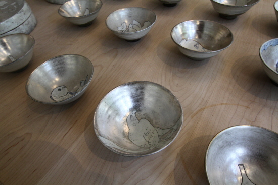 도예가 허상욱의 <분청일기>가 5월 16일부터 6월 6일까지 한남동 핸들위드케어에서 열렸다. 허상욱 작가는 화장토를 바른 후 바탕을 긁어내는 박지기법을 이용해 일상과 자연에서 찾은 풍경을 일기를 쓰듯 분청에 담는다. 이번 전시에는 화장토를 긁어 작은 점을 반복해서 남긴 스타카토 시리즈의 스툴, 화병, 다관과 차합 등도 선보였다. 새, 연꽃, 잉어, 백자, 저고리 등 민속적인 소재를 그리고 은을 발라 문양과 바탕의 대비가 돋보이는 은채 작품이 눈길을 끌었다.