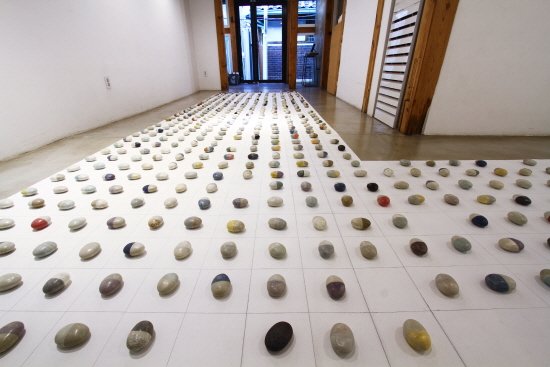 기원의 마음을 조약돌 형태로 표현한 곽경화의 <어떤 돌, 스스로 구르는>전이 지난 10월 30일부터 11월 28일까지 갤러리우물에서 열렸다. 이번 전시는 ‘돌’을 주제로 저마다 다른 크기와 무게, 색감, 패턴 의 도자 돌 1,000 점을 선보이는 자리다. 작가는 친구의 여행길에 안녕을 기원하며 선물한 작은 돌 오브제를 시작으로, 다른 도구 없이 손으로 굴려 도자 돌을 빚어오고 있다. 그는 돌을 빚으며 자연스럽게 기도와 염원을 담는다. 전시장에는 도자 돌을 바닥에 넓게 늘여 놓아 관람객이 자유롭게 쥐고, 쓰다듬으며 ‘나와 함께할 돌’을 찾을 수 있게 했다.