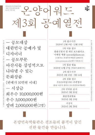 온양민속박물관이 주관하고, 아산시와 한국공예디자인문화진흥원이 후원하는 <온양어워드>가 세 번째 공모를 한다. 공모 분야는 충남 아산지역의 문화, 역사, 관광자원의 기반이 될 수 있는 문화상품으로, 지원 자격은 국내 공예가와 디자이너를 대상으로 한다. 접수방법은 박물관 홈페이지www.oymuseum. or.kr에서 출품신청서를 다운로드 받아 작성해 개인 포트폴리오(10장 이내)와 함께 이메일 제출(oyaward@daum.net)로 제 출하면 된다. 1차 결과는 12월 17일 홈페이지를 통해 발표할 예 정이다. 2차 접수는 1차 합격자에 한해 2021년 2월 13일부터  2월 14일까지 양일간 우편 혹은 방문을 통해 반드시 실물, 프로토타입(샘플)으로 제출해야 한다. 인터뷰 심사는 2021년 2월 20일에, 최종 결과는 2021년 2월 25일에 박물관을 통해 발 표할 예정이다. 시상에는 최우수상(1명)에 상금 1000만원, 우수상(1명)에 상금 500만원, 장려상(2명)에 200만원이 주어진 다. 수상작 전시는 수상전시를 순회하며 선보인다.