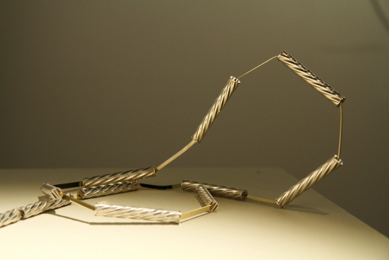 점, 선, 면의 조형요소를 변주해 구조적인 장신구를 제작하는 금속공예가 김지영의 <달의 뒤 Back of The Moon>전이 11월 4일부터 10일까지 KCDF 갤러리에서 열렸다. 이번 전시는 ‘달의 뒤’처럼 보이지 않는 부분에 조형적 재미를 더한 목걸이, 브로치, 술잔, 팬던트 등의 금속 장신구와 기를 선보였다. 그의 작품은 큰 직선에 숨은 결합구조를 펼쳐 율동감 있는 목걸이와 브로치를 만들고, 은잔에 빼곡하게 얇은 면 요소를 더해 잔을 기울일 때마다 술과 금속이 함께 찰랑이는 소리를 즐기는 등 조형 요소에 기능과 장식의 역할을 부여한다.