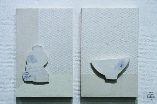 도자, 지승, 민화 등 다양한 공예·미술 분야를 작업 하는 김수지 작가의 <인앤아웃IN&OUT>전이 12월 16일부터 22일까지 인사동 토포하우스에서 열렸다. 이번 전시는 청화백자와 한지로 제작한 책가도, 청화로 모란문을 새긴 생활자기, 접시 문양을 소재로 한 민화 등 넓은 분야에 걸쳐 작업하는 작가의 다양한 작품을 선보이는 자리였다. 지승공예 기법을 응용해 다양한 텍스처로 그림의 바탕을 만들고, 그 위에 책, 달항아리, 사발 등을 평면화한 작은 도판을 부착해 제작한「신新책가도」가 관심을 끌었다.