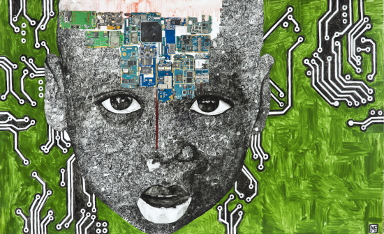 이런 척박한 환경에서 스타니스는 ‘전쟁과 테크놀로지 War and Technology’라는 주제로 시각적인 효과를 극 대화시켜 작품을 제작하고 있다. 그의 작품을 보면 컴퓨 터나 휴대폰에 들어가는 기본 프로그램 보드 등의 전선 을 배경으로 하여 사람의 얼굴 신체 등과 결합시킨다. 동 시에 아프리카의 전통문양을 작품에 적용해 콩고의 과거 와 현재를 나타내고 있다.