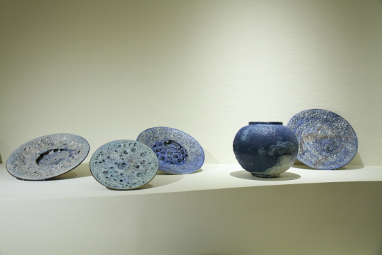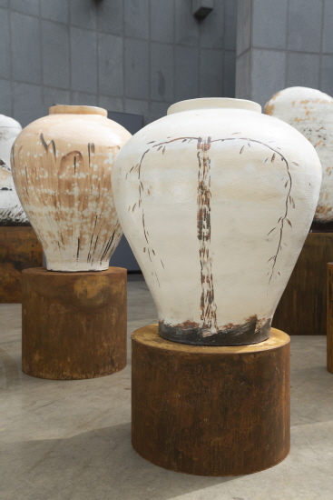 전시의 서막을 여는 중앙홀에는 이강효 작가의 분청항아리를 설치한 「달, 산수」가 웅장하게 전시됐다. 작가는 이번 전시를 통해 지난 40년 작업 세월을 총망라하는 대형 분청산수 달항아리와 산을 형상화한 30여개의 작품을 선보였다. 제작 과정 중 생긴 틈에 도자 파편을 채워 넣은 신작도 소개했다. 작품이 형상화한 산과 달, 산수가 그려진 전시대, 그리고 돔을 통해 들어오는 햇살은 조화를 이뤄 자연을 그대로 옮겨놓은 듯한 분위기를 자아낸다.