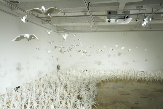전시는 초기에 오브제 작업을 독립적으로 보여주던 형식에서 점차 주어진 공간을 적 극적으로 활용하는 설치작업으로 발전한 다. 언뜻 보면 자연 속, 어딘가에 실재하는 풍경을 전시장에 옮겨 놓은 듯하나, 흑백사 진의 한 장면과 같이 설치된 흰색의 오브제