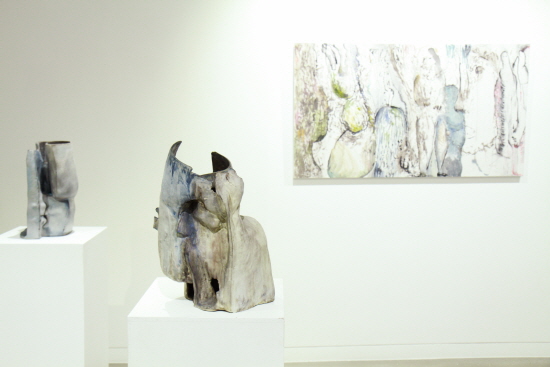 박지원 작가의 첫 번째 개인전 <사물의 단면>이 5 월 5일부터 30일까지 갤러리밈에서 열렸다. 이번 전시에는 작가의 행위가 묻어난 도자조형과 스툴, 화병 그리고 회화작품을 선보였다. 작가는 촉촉한 상태의 흙판을 세워 작업한다. 건조되지 않아 유연 성을 유지한 흙판은 휘거나 찢어지고 무너진다. 그 과정에서 작가는 반사적으로 흙을 손으로 받치거나 붙잡아 형태를 유지시킨다. 그는 적극적으로 흙의 물성을 활용해 우연성을 유도하지만 결코 자신의 의도를 앞세우지 않는다. 또한 실험을 통해 직접 만 든 유약으로 시유해 다채로운 색감을 선보였다.