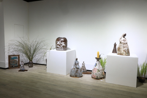 도예가 김미경은 2011년부터 <mom’s room>이라는 큰 주제로 거의 해마다 개인전을 열고 있다. 지난 해에는 코로나19 로 인해 불가피하게 건너뛰었고 올해에 대전의 모리스 갤러리에서 여덟 번째 개인전을 가졌다. 이번 전시의 제목은 <처음부터 함께 계셨다>. 제목을 보고 언뜻 짐작할 수 있듯이 작가에게 ‘처음부터 함께 계신’ 주체는 하느님이다. “도예가로 20년간 활동해 왔어요. 그동안 작가로서의 삶을 당연하게 만 여겼는데 코로나19로 인해 많은 변화가 일어나면서 새삼 얼마나 감사한 일인지 깨달았습니다. 저의 의지와 상관없이 흘러가는 일들이 두려우면서도 이 모든 일을 관장하시는 하느님의 자비를 느낄 수 있었어요.” 작가는 20년간 대전 시내에서 운영해 온 공방 겸 숍을 닫고 옥천에 있는 작업실로 들어갔다. 평화로운 자연으로 둘러싸인 옥 천 작업실에서 작업에 몰두하는 행복을 누리면서 ‘이 모든 것은 주관하는 그분의 섭리 안에 함께한다는 사실을 알게 되었다’. 전시장에 들어서서 처음으로 마주한 ‘처음 부터 함께 계셨다’는 우리를 바라보는 하느님의 눈과 그분을 바라보는 우리의 눈을 함께 표현한 작품이다. 수많은 ‘눈’들이 시선을 던지는 이 도판 작업을 통해 작가는 ‘처음부터 함께 계셨다’는 메시지를 강렬하게 주고 있다. 사실 천주교인인 작가에게는 ‘처음부터 함께 계신’ 존재가 하느님이지만 어떤 사람에게는 다른 절대자나 신, 혹은 어머 니일 수도 있다. 작가는 그 주체에 대해 모든 가능성을 열어 놓고 있다. 작품을 보는 사람에 따라 해석은 얼마든지 달라지고 확장될 수 있다. 「바라보다」 시리즈 역시 마찬가지이다. 작가는 성경에 나오는 롯의 아내를 모티프로 여성의 형상을 빚고 그렸지만 감상하는 사람에 따라 어머니나 자신을 넉넉하게 품어주는 존재, 혹은 여성 그 자체로 받아들일 수 있을 것이다.