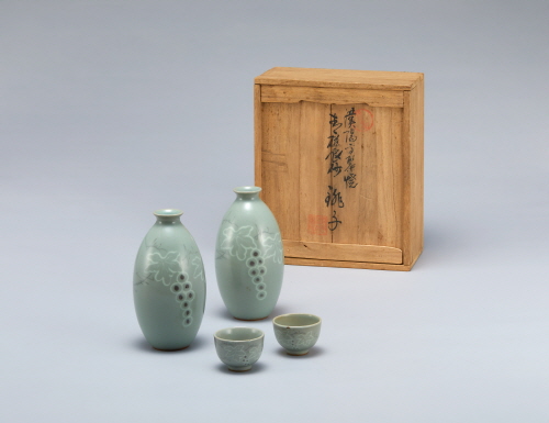 청자상감동화포도문 술병과 잔, 한양고려소, 일제강점기, 13.5×2.7×3. 5,3.0×4.5×2.0cm, 고불미술관 소장, 사진제공_경기도자박물관
