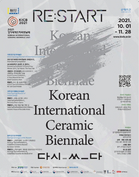 올해로 11회를 맞이하는 2021 경기세계도자비엔날레는 ‘다시_쓰다Re:Start’라는 주제로 10월 1일부터 11월 28일까지 이천 경기도자미술관, 여주 경기생활도자미술관, 광주 경 기도자박물관 ,온라인플랫폼www.kicb.or.kr에서 온·오프라인으로 개최한다. 이번 행사는 ‘전시행사’, ‘온라인플랫폼’, ‘부대행사’로 나뉘어 열린다. ‘전시행사’로는 국제공모전, 비엔날레 특별전 <네덜란드 국가초청전>, <대상작가 초대전>, <다시, 흙-모래-자갈>, <회복, 공간을 그리다>, <작은 예술가의 집>, <코발트 블루> 등이 펼쳐진다.