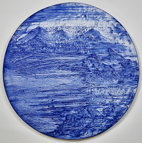 ‘청색, Blue’를 사용하는 작가들은 많다. 청 색이 가지는 상징적인 의미는 무수하다. 사 람들은 가끔 여유를 찾고 싶을 때, 하늘을보거나 먼 산, 그리고 드넓은 바다를 바라본 다. 푸른 빛, 청색이 갖는 의미는 여기서 답 을 찾을 수 있다. 청색에는 꾸밈이나 화려 함 보다는 단순하고 절제된 특성이 강하다. 도자용 코발트 안료가 흘러내리는 기법을 수 없이 반복하는 작업은 깊은 내면으로부 터 솟아나는 작가의 본질이자 세상의 이치, 그리고 자연의 에너지를 표현해내고자 하 는 것이다.