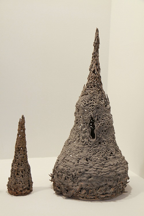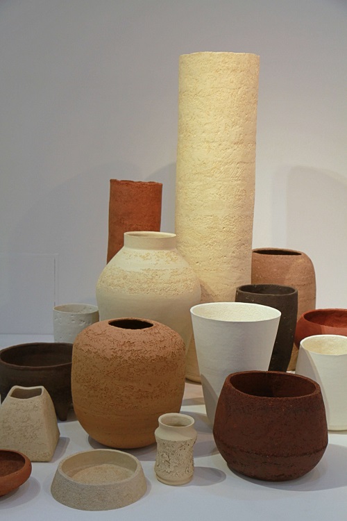 욜란 판 더 빌Jolan van der Wiel의 「용기Vessels」은 자석을 이용해 만들었다. 약간의 기술을 더한 작품인데, 흙에 철iron을 넣고 위에서 좌석으로 끌어당겨 텍스쳐를 완성한 것이다. 펨커 데커스Femke Dekkers의 「용기Vessels 1,2,3」 작품도 재미있다. 이 작 가는 흙 만지는 걸 싫어해, 흙으로 만든 기물을 앵글을 만들어 찍어서 보면 볼륨감 있게 느껴지지만 사실은 사진이다.