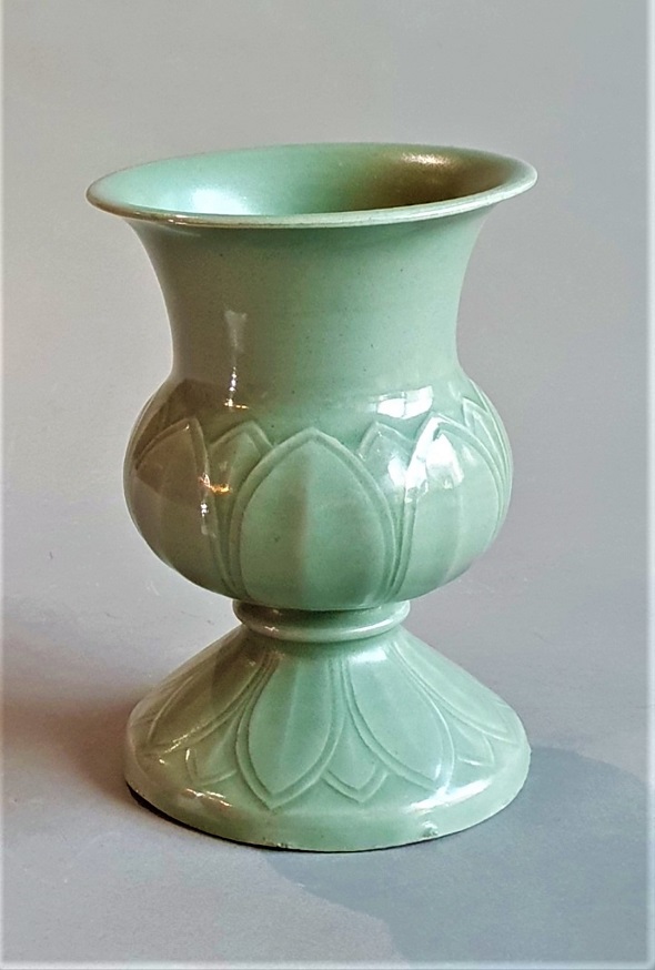 고려시대는 종교행사와 차모임 행사에 향을 피웠다. 향 을 피우는 도구로 향로와 향완이 있는데 절구모양으로 생긴 것을 향완이라 한다. 이 유물은 윗부분 몸통과 아래 받침을 따로 성형하여 붙인 것이다. 몸통은 연봉에서 향 이 피어나는 모습으로 제작하였고 받침도 복련으로 양각하여 만들었다. 몸통과 다리를 이어 붙여서 소성하기 때문에 고열로 인하여 대부분 몸통이 한쪽으로 기울게 된다. 12세기 초반에 제작된 것으로 보이는 이 작품은 연꽃 의 조각 기술이 매우 뛰어나며 청자의 발색도 맑고 투명 한 ‘비색청자’라 할 수 있는 일급품이다. 굽바닥 가장자리에 내화토 받침을 조금씩 사용하여 번조하였다. 현존하는 수량이 적은 기형으로 발색이 특히 뛰어나고 보존상태도 온전한 명품으로 일본 ‘야마또문화관’ 특별전시회에 출품 전시되었던 작품이다.