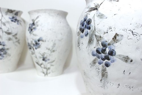 강은종 작가는 청화의 발색과 농담의 화학적 반응을 통해 자신만의 색감을 표현한다. 산화망간이 청화의 발색에 영향을 주는 점을 착안해, 다양한 유약을 개발하여 독특한 색상을 연출한다. 이번 전시는 수묵적인 효과에 소지의 물성을 활용하여 일상의 소소한 경험을 표현함으로써 쓰임새도 생각했다. < 담淡>은 여운있는 담백함과 오래된 흔적을 나타내 고자 토기의 질감을 차용했다. 토기의 투박하고서 정적인 느낌을 백자의 물성에 결합시켜 회화적인 표현도 확장했다.