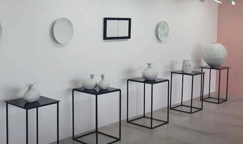 고용석 작가의 제 18회 개인전 <고요한 도자기>가 지난 2월 3일부터 27일까지 제주 루씨쏜 아뜰리에에서 열렸다. 이번 전시는 자연에서 영 감을 얻어 작업한 백자를 선보였다. 그는 파도치는 바다, 비 내리는 풍 경 등 제주의 자연경관에서 느낀 향수鄕愁를 청백색을 띄는 맑은 백자 로 표현한다. 전시는 풍만한 몸체와 좁은 부리를 가진 화병, 비오는 풍 경을 세로 음각선으로 새긴 도판작업, 전통의 미를 살린 달항아리 등 다 양한 백자 작업물을 선보였다.