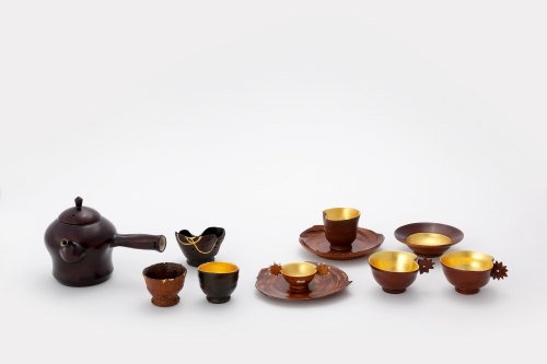 「옻칠 주자」 18×15×13cm | 백토, 옻, 재유 | 2022 「옻칠 금박 잔」 5×5×5cm내외 | 황토, 옻, 금박 | 2004