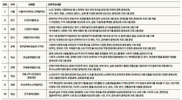 문화체육관광부가 주최하고 (재)한국공예·디자인문화진흥원이 주관하는 공예 교육프로그램 <행복한 공예교육>이 7월 중순부터 시행됐다. 이 번 사업은 전국 지역별 공예가들과 문화취약계층을 연계해 공예가들의 자생력 제고 및 소외계층의 문화향유 기회를 확대하는 취지로 마련된 것 으로, 공진원은 지난 2월부터 5월까지 공모를 통해 전국 광역 단위별로 교육을 운영할 단체를 선정했다. 서울여자대학교산학협력단, (재)한국도 자재단과 (사)우리들의 눈, (사)한지개발원, 청주공예비엔날레조직위, 충남공예협동조합, 전북공예협동조합, (재)나주시천연염색문화재단, 부산 대학교산학협력단, 진주공예인협회 총 10개 단체가 전국적으로 공예교육을 기획하고 운영한다. 프로그램은 수행단체별로 지역 공예가 4명이 한 팀을 이뤄 각 팀이 15개 문화소외시설에서 진행한다. 시설별 10여명을 대상으로 최소 10회차 교육을 실시해 일회성 체험이 아닌 지속적인 문화 향유의 기회를 제공한다.