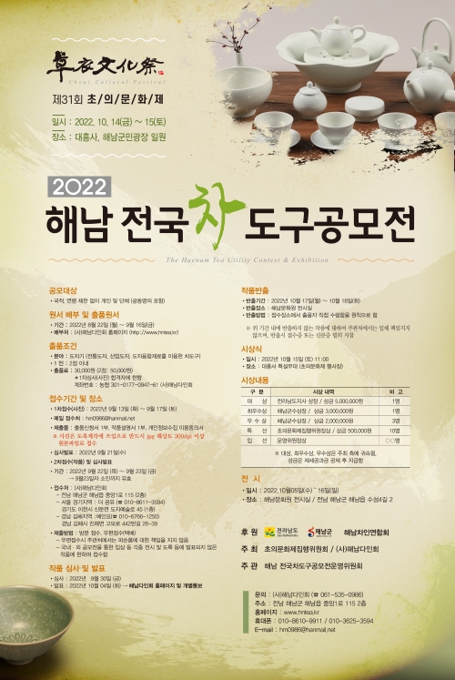 오랜 전통을 지닌 해남청자와 차문화 발전을 도모하고 전국적인 다도 구 개발을 위해 <제4회 해남 전국 차도구>를 개최한다. 공모 대상은 전통도자와 산업도자, 타재료를 융합한 ‘차도구’를 대상으로 하며, 개 인 및 단체 참여가 가능하다. 출품은 1인 2점 이내로 가능하며, 출품료 는 3만원(2점은 5만원)이다. 접수는 8월 22일부터 9월 16일까지 이메 일 접수(hm0986@hanmail.net)로 받는다. 1차 서류 접수는 해남다인 회 홈페이지에서 출품신청서, 작품설명서, 개인정보수집 이용동의서 를 다운로드 받아 작성해 보내야 한다. 2차 실물접수는 9월 22일부터 23일까지 접수받는다. 수상작 발표는 오는 10월 4일에 해남다인회 홈 페이지를 통해 발표된다. 수상자에게는 대상(1명) 5백만원, 최우수상 (1명) 3백만원, 우수상(3명) 각 2백만원, 특선(10명) 각 50만원이 수여 된다. 수상작품은 10월 5일부터 16일까지 12일간 해남문화원 전시실 에서 선보인다.