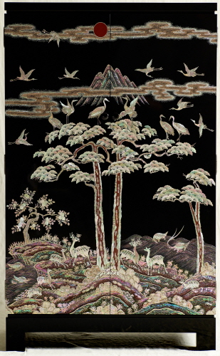 란(경기 안산) 작가의 「십장생문 나전 장식장」은 백골에 삼베를 감싸고 옻칠을 여러 번 올려 장식하는 목심 저피칠기 기법으로, 십장생을 자개로 장식해 생동감을 주고 흑칠마감으로 깊이감 있는 완성이 뛰어나다