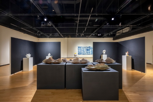 필자는 두 개의 벽걸이 세라믹 작품 「수유Feeding」가 노던 켄터키 대학교에서의 전시 <여기 저기: 문화 사이 탐색하기Here and There: Navigating the Cultural In-Between>에 선정돼 전시에 참가할 수 있었다. 이 대학의 예술과 과학Arts and Science 분야의 평등과 다양성을 수용하기 위한 특별 연구비(5,250달러)의 지원으로 마련된 이번 전시는 대학 갤러리 큐레이터인 강소라의 주도 아래 미국에서 왕성히 활동하고 괄목할 만한 성과를 보이는 한국 도예가와 한국계 미국작가들의 작품을 선정하였다. 참가 아티스트들은 여선구, 이훈, 샘정, 박경민, 김근영, 곽윤지, 설하윤, 최수진, 안오드리, 이지은, 이예림, 손혜원, 전신연, 김완수, 김연수 총 15명이다.
