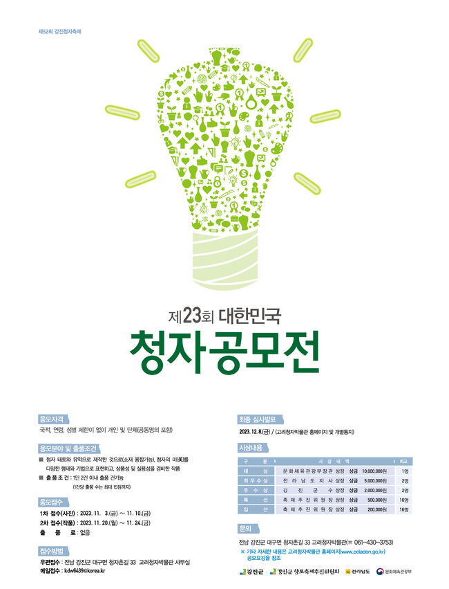 강진군이 주최하고, 고려청자박물관이 주관하는 제23회 <대한민국 청자공모전>이 작품을 공모한다. 이번 공모는 청자토와 유약을 이용해 청자의 미를 다양한 형태와 기법으로 제작한 작품을 대상으로 한다. 공모 조건은 1인당 2점 이내로 출품료는 무료이다. 지원대상은 국적, 연력, 성별 제한없이 모든 개인과 단체가 지원가능하다. 공모 조건은 1인당 2점 이내로 출품료는 무료이다. 지원대상은 국적, 연력, 성별 제한없이 모든 개인과 단체가 지원가능하다. 접수방법은 출품신청서, 작가 및 작품 설명서, 개인정보 수집이용 동의서 등을 작성해 이메일이나 우편 접수한다. 1차 사진접수는 11월 3일부터 11월 10일까지 8일간 접수를 받고, 2차 실물작품 접수는 11월 20일부터 11월 24일까지 5일간 접수를 받는다. 대상(1명)에게는 상금 1천만원이, 최우수상(2명)에 상금 5백만원, 우수상(2명)에 상금 2백만원, 특선(10명) 50만 원이, 입선(16명)에 20만원의 상금과 상장이 수여된다. 공모결과는 12월 8일 고려청자박물관 홈페이지(www.celadon.go.kr)와 개별연락을 통해 발
