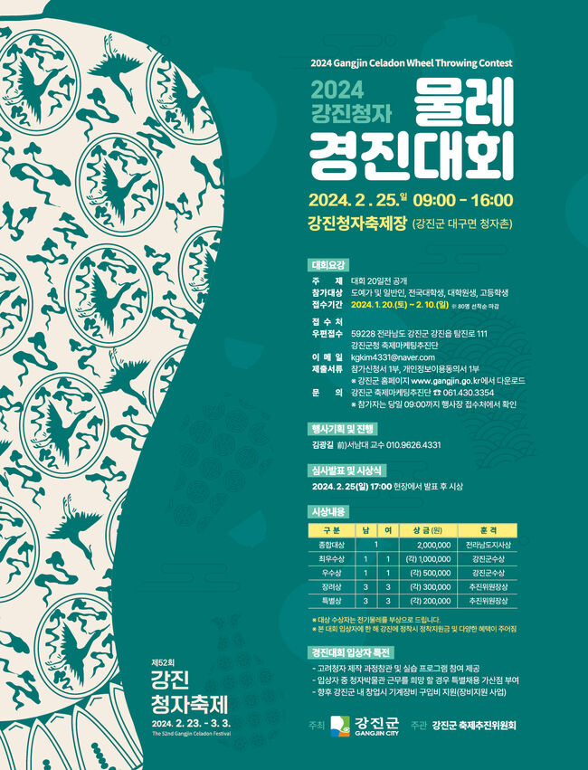 강진 고려청자 계승·발전과 지역경제 활성화를 위한 취지로 열리는 <제52회 강진청자물레경진대회>가 1월 20일부터 2월 10일까지 우편 접수를 받는다. 대회 주제는 물레성형으로 대회 참가는 고등학생이면 가능하다. 출품 신청서는 강진군 홈페이지www.gangjin.go.kr에서 교부받아 작성하고 강진군청 기획홍보실에 우편 접수 또는 방문 접수하면 된다. 경연 일자는 2월 25일이며 참가자는 당일 오전 9시까지 강진청자축제장 내 접수처에 등록해야 한다. 심사발표 및 시상식은 2월 25일 오후 5시 현장에서 발표 후 진행된다. 종합대상(1명) 상금 2백만 원과 전기 물레, 최우수상(2명) 상금 각 1백만 원과 상장, 우수상(2명) 상금 각 50만 원과 상장, 장려상(6명) 상금 각 30만 원과 상장, 특별상(6명) 상금 각 20만 원과 상장이 수여된다.
