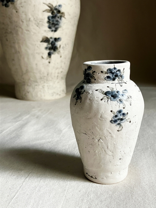 강은종 작가는 백자의 무결한 심상에 토기의 분방한 자국을 입혀 두 미감의 교차 영역을 지어낸다. 수많은 잔상을 응축시킨 덩어리처럼 보이는 것은 ‘모아둔 잔상’을 전시 주제로 삼은 작가의 함의와 부합했다는 방증이기도 하다. 회화의 소재로 동백, 모란, 붓꽃 등 자연물을 삼은 것은 일상의 온기를 보듬고, 나누기 위한 미적 실천이며 도예가의 소임으로써 그가 품고 있는 사명감이기도 하다. 작가는 “차 한 모금, 열매 한 알을 먹더라도 소소한 행복을 느끼고, 그 감정을 나눈다는 것은 가슴 벅찬 일”이라고 소회를 전했다.