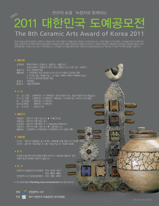 - 경상남도와 김해시가 주최하고 김해도예협회와 김해분청도자박물관이 주관한 이 지난 9월 최종 수상작을 발표했다.대상_ 강창성 「시간의 결」분청사기의 본 고장인 김해시에서 전통과 현대의 표현 방법이 다양한 분청 미의 계승 발전과 분청도자문화의 확산과 보급, 도예가들의 창작 고취를 위해 매년 개최하고 있는 이번 공모에는 총 109.