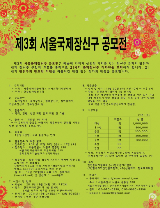 - 경상남도와 김해시가 주최하고 김해도예협회와 김해분청도자박물관이 주관한 이 지난 9월 최종 수상작을 발표했다.대상_ 강창성 「시간의 결」분청사기의 본 고장인 김해시에서 전통과 현대의 표현 방법이 다양한 분청 미의 계승 발전과 분청도자문화의 확산과 보급, 도예가들의 창작 고취를 위해 매년 개최하고 있는 이번 공모에는 총 109.