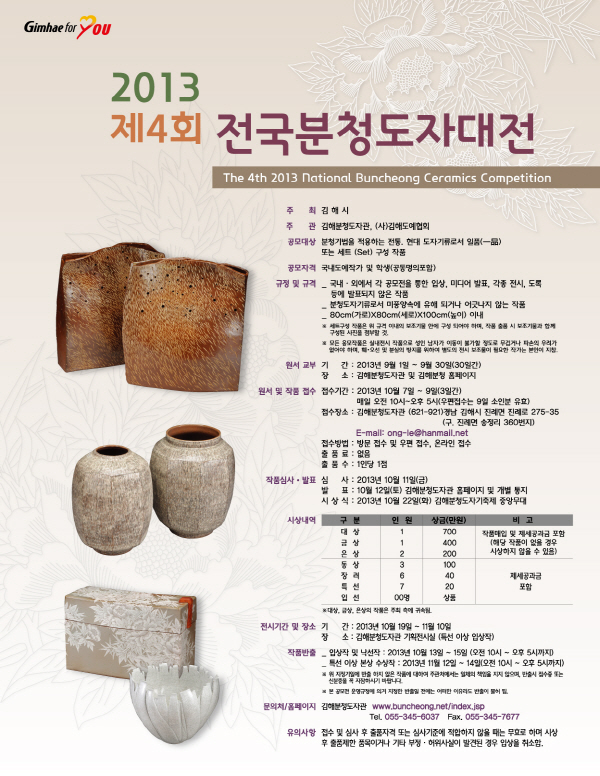 - 경상남도와 김해시가 주최하고 김해도예협회와 김해분청도자박물관이 주관한 이 지난 9월 최종 수상작을 발표했다.대상_ 강창성 「시간의 결」분청사기의 본 고장인 김해시에서 전통과 현대의 표현 방법이 다양한 분청 미의 계승 발전과 분청도자문화의 확산과 보급, 도예가들의 창작 고취를 위해 매년 개최하고 있는 이번 공모에는 총 109.
