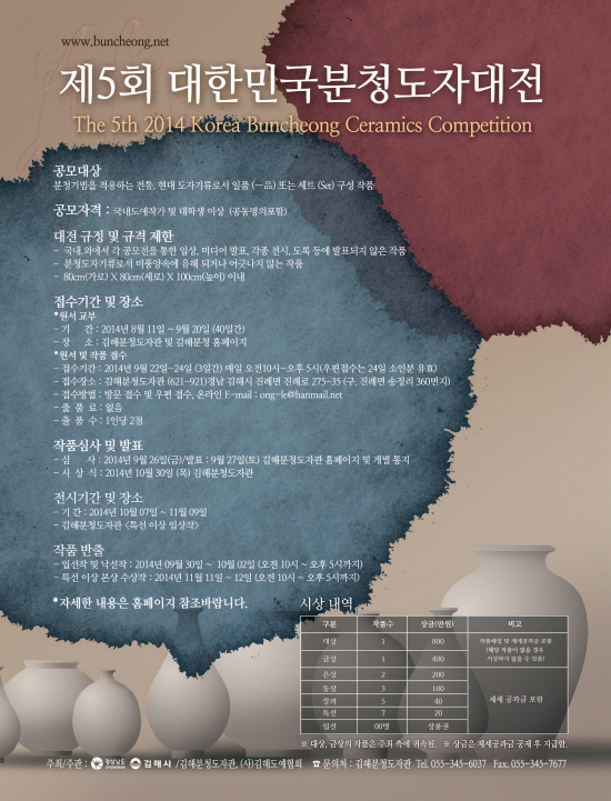 - 경상남도와 김해시가 주최하고 김해도예협회와 김해분청도자박물관이 주관한 이 지난 9월 최종 수상작을 발표했다.대상_ 강창성 「시간의 결」분청사기의 본 고장인 김해시에서 전통과 현대의 표현 방법이 다양한 분청 미의 계승 발전과 분청도자문화의 확산과 보급, 도예가들의 창작 고취를 위해 매년 개최하고 있는 이번 공모에는 총 109.
