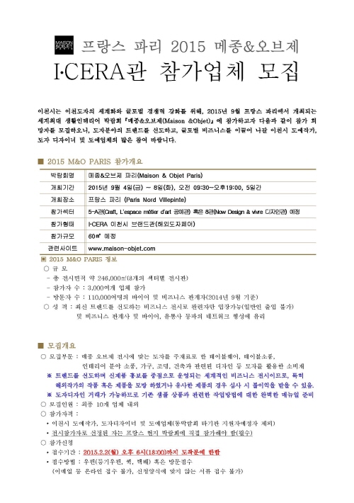 프랑스 파리 2015 메종&오브제 I.CERA관 참가업체 모집
