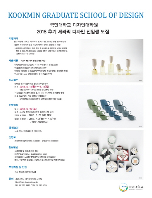 국민대학교 디자인대학원 2018 후기 세라믹 디자인 신입생 모집(5/14~6/14)