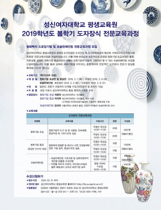 성신여다재학교 평생교육원 2019학년도 봄학기 도자장식 전문교육과정(2019.2.1~)