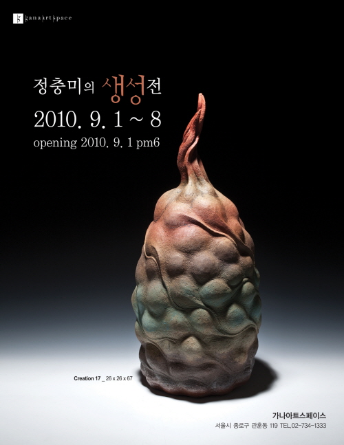 주제 <생성>은 작가가 생태계에서 만난 생명체들 알과 정자, 올챙이와 같은 형상으로 표현된다. 정충미의 작품은 모든 것을 포용하는 비정형의 형상을 지녀 포근하고 다정한 어머니의 품을 닮아있다. 그의 작업은 작은 것들을 결집해 움직임을 유발하는 조용한 태동과도 같다. 정자와 올챙이의 동일화라든지, 계란 노른자 등은 형상을 탄생시키는 원동력이 됨과 동시에 각자가 자신의 내면에서 진화하는 다양성의 가능태를 지니게 한다. 모든 생명을 품고 있는 대지의 품, 자연의 품, 어머니의 품 등은 우리에게 삶과 죽음, 끊임없이 생성하고 소멸되는 순환의 과정들을 기대하게 한다.