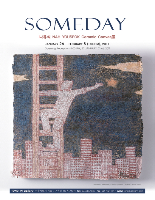 나유석의 개인전이 열린다. 작가는 캔버스처럼 가벼운 도판을 만들어 보고자 노력하였고, 수많은 시행착오를 거쳐 그 결과물을 얻어냈다. 그가 세라믹캔버스에 그리는 그림들은 특별한 그림이 아닌 그의 주변에서 흔히 발견해내는 일상의 이야기들을 담아낸 그림이다. 이번전시를 통해 그가 보여주는 someday가 세상 모든 이들이 사랑할 수 있는someday가 되길 기대해 본다.02.733.4867