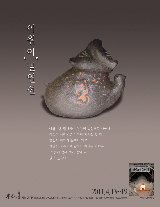이원아 <필연>전2011.4.13~4.19 서울 목인갤러리아름다운 별나라에 인간의 형상으로 나타나어설피 사람노릇 다하려 채찍질 할 때 말없이 다가와 동행이 되고 다양한 모습으로 왔다가 떠나는 인연들 그 중에 짧은 생애 빛이 된 필연 있으니.02.722.5066