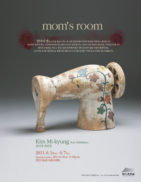 엄마의 방은 안식을 필요로 하는 내 지친 일상속에서 휴식과 충전을 허락하는 쉼터다. 사유속에서 엄마의 방은 일상 속 따스한 소통이 흐르는 공간이다. 그곳이 우리 열정의 원류임을 기억하고자 한다. 엄마의 손재봉틀, 맛나고 정성스럽게 준비해주셨던 식탁, 리모컨이 없던 시절의 텔레비전 등. 도자기와 조우한 현대적으로 재해석된 전통자수가 우리를 풍성한 기억 속으로 안내할 것이다.