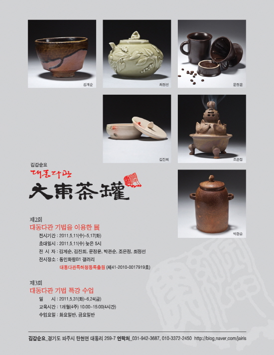 김갑순요에서는 대동다관 제작기법을 3년여에 걸쳐 터득해 우리식의 기법으로 자리매김하고 있다. 김계순, 김진희, 문정윤, 박관순, 조해단, 최정선 6명의 작가들은 각자의 주제를 선정해 기물의 특성과 작품의 아름다움을 표현하고 한 생명을 잉태하는 듯한 고통과 인내로 살아 숨 쉬는 작품을 제작했다. 이번전시를 통해 노년에 흙을 즐기고 생활에 필요한 그릇의 다양성을 제시하는 대동다관 기법을 알리고 차茶산업과 도자 산업발전에 한 발 더 거듭 나는 김갑순요의 전시를 볼 수 있다.