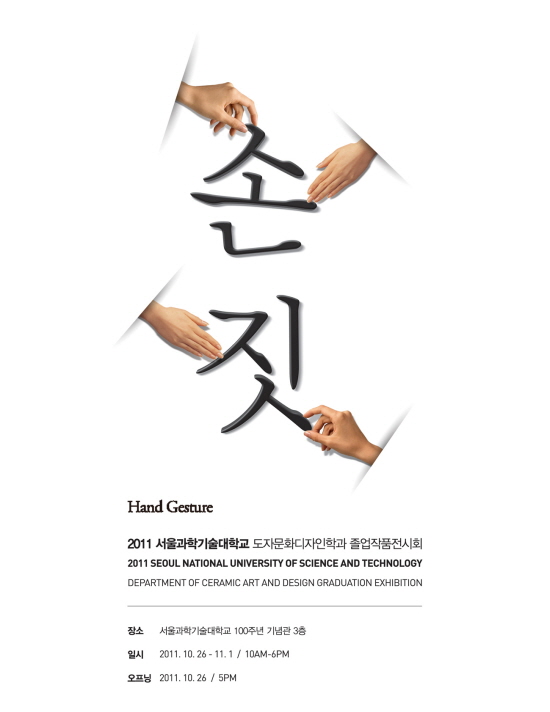 2011 서울과학기술대학교 도자문화디자인학과 졸업작품전시회2011.10.26~11.1 서울과학기술대학교 100주년 기념관 3층서울과학기술대학교 도자문화디자인학과 졸업작품전시회가 ‘손짓’을 주제로 10월 26일부터 열린다. 졸업을 앞둔 재학생들이 선보이는 이번 전시에는 흙의 질감을 물씬 풍기는 정갈한 물레 작업부터 학생들만의 독특한 아이디어가 돋보이는 조형물 및 설치작품에 이르기까지 다양한 작품들을 선보일 예정이다.02.970.6114