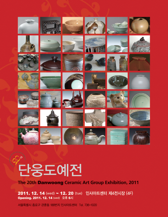 20주년 단웅도예전2011.12.14~12.20 서울 인사아트센터단웅회는 단국대학교 교육원 도예연구소에서 도자를 공부한 동문모임이다. 1991년 첫 정기회원전을 시작으로 올해 20주년을 맞아 기획전시를 마련했다. 이번전시는 초대작가전과 40여명의 회원전으로 구성되었으며, 회원 각자의 개성과 생각을 흙을 통해 다양하게 선보인다.02.736.1020