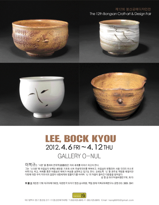 이복규 <마음을 담은 다완>전2012.4.6~4.12 대구 갤러리오늘이복규의 <마음을 담은 다완>전이 열린다. 작가는 전통이란 박제된 것이 아닌 진정한 생명력을 가진 작품이라고 생각한다. 작가는 얼굴과 몸으로 표현되는 천변만화하는 마음을 다완에 담는다. 이번전시에는 心자형을 넣은 현대 ‘다완’ 전을 펼쳐 보인다. 053.425.6845