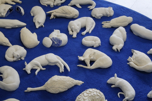 동물에게서 사람의 모습을 발견해 조형작업으로 풀어가는 작가 김지호의 첫 개인전이 열렸다. ‘우리에 갇힌 동물은 우리와 같다’를 주제로 포유류, 설치류, 조류 등 다양한 동물 조형을 선보였다. 학대라는 고통의 흔적을 가진 동물의 얼굴을 인위적으로 지운 뒤 그 자리에 새싹을 결합해 붙이거나, 동물원에 갇혀 사는 개체의 몸통을 갈라 그 단면에 서식지를 그려 넣는 방식 등 윤리의식과 환경에 대한 문제의식을 작가만의 해석이 담긴 오브제로 전하고 있다.