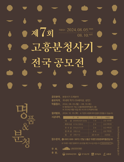 고흥분청문화박물관이 주최하는 <제7회 고흥분청사기전국공모전>이 오는 8월 5일부터 10일까지 6일간 작품을 접수받는다. 이번 공모는 분청사기의 전통을 잇고, 국내외 도예가의 예술적 기량을 한껏 펼칠 수 있는 장을 마련하기 위해 개최된다. 응모 대상은 19세 이상 국내외 작가이며, 1×1×1m 이내 규격의 분청사기 작품이라면 1인 1작품씩 지원 가능하다. 접수는 방문 접수만 가능하며 8월 10일 16시까지 고흥분청문화박물관 강당으로 제출하면 된다. 완성도, 창의성, 표현성, 예술성, 역사성을 기준으로 심사되며, 10월 10일 수상작을 발표할 예정이다. 대상 수상자 (1명)에게 상금 1천만 원, 최우수상(2명) 각 상금 6백만 원, 우수상(3명) 각 상금 4백만 원, 장려상(4명) 각 상금 1백만 원과 상장이 수여된다.