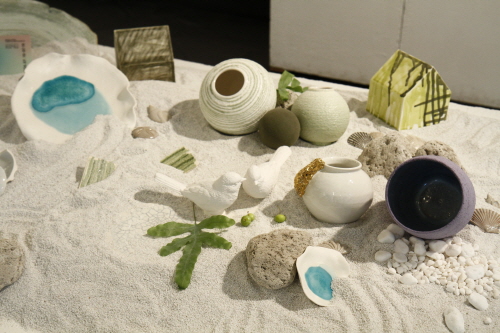 이번 전시는 경희대학교 도예학과 여성 동문으로 구성된 도자그룹 형形의 24번째 전시로서 저마다의 도식으로 여름 풍경의 면면을 도자에 담았다. 바위, 개울, 나무 각각의 색채를 세라믹 펜슬의 예리한 필치로 그린 이은주, 수풀의 잎맥 결을 평면화한 이휘민, 녹청색 유약이 흘러내리는 형상의 화기를 선보인 박주영은 여름의 우거진 녹음을 소재로 공유했다. 옥원지는 백자 플레이트 내부에 청자유를 채워 소나기가 고여 있는 풍경을 연출했고, 박보영의 사실적 묘사로 탄생한 참새 오브제는 자갈과 모래 곳곳에 놓여 생동감을 더했다.