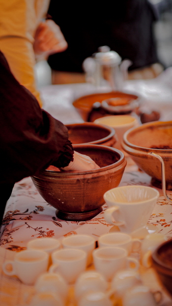 옹기커피는 전통 옹기 중 확독에 원두를 그라인딩 후 브루잉하는 커피로 같은 원두를 사용해도 커피로 맛과 향이 달라지는 것을 체험하고 전통 확독에 대해서 알 수 있도록 하였다.