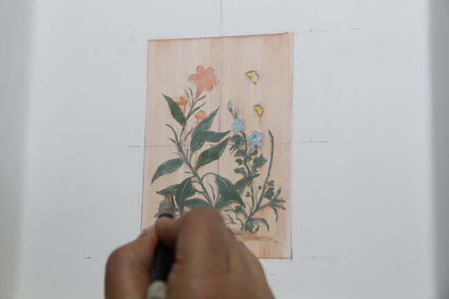3 미리 체크해놓은 직사각형 안에 초충도에 그려진 잎, 꽃, 곤충을 스케치한다.